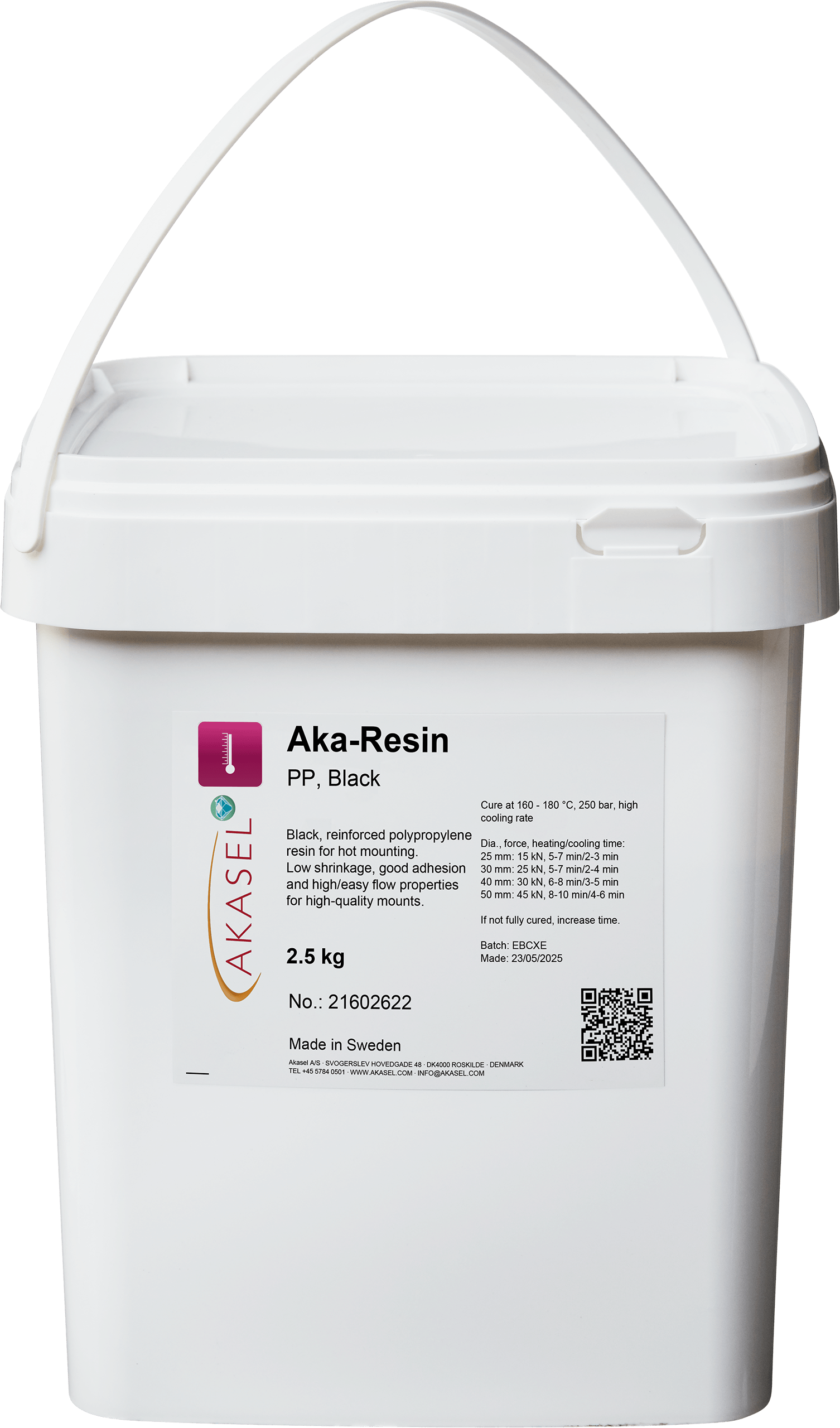 Schwarzes, mineralverstärktes Polypropylenharz für die Warmeinbettung. Aka-Resin PP ist ein staubfreies Harz mit geringer Schrumpfung, guter Haftung und hohen/leichtfließenden Eigenschaften für hochwertige Einbettungen.