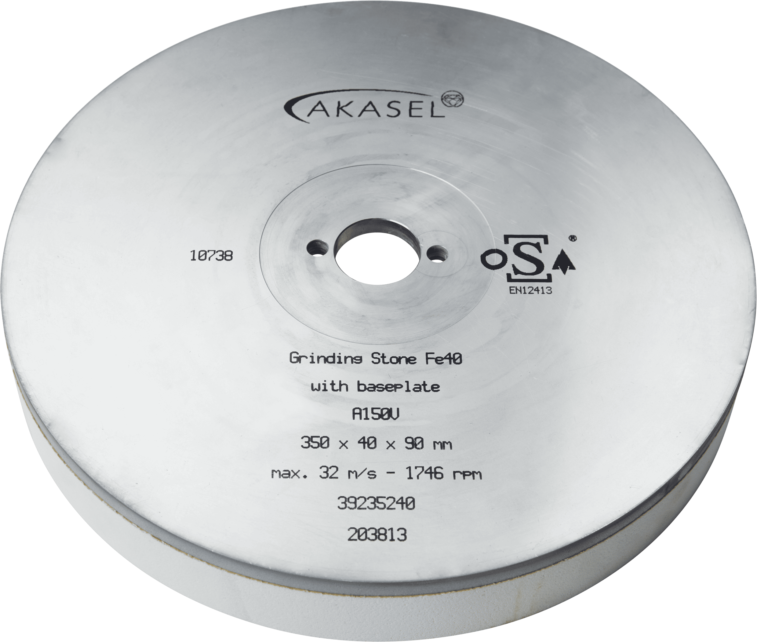 • Meule Akasel Fe40 en oxyde d'aluminium de couleur blanche avec une ouverture centrale. Marques : "Akasel", "Grinding Stone Fe40", "A150V", "356 x 45 x 38 mm", "1718 1/min = 32 m/s", "39136240", "19010657". Spécialement conçue pour les applications métallographiques, idéale pour le ponçage des métaux ferreux avec une granulométrie de 150.