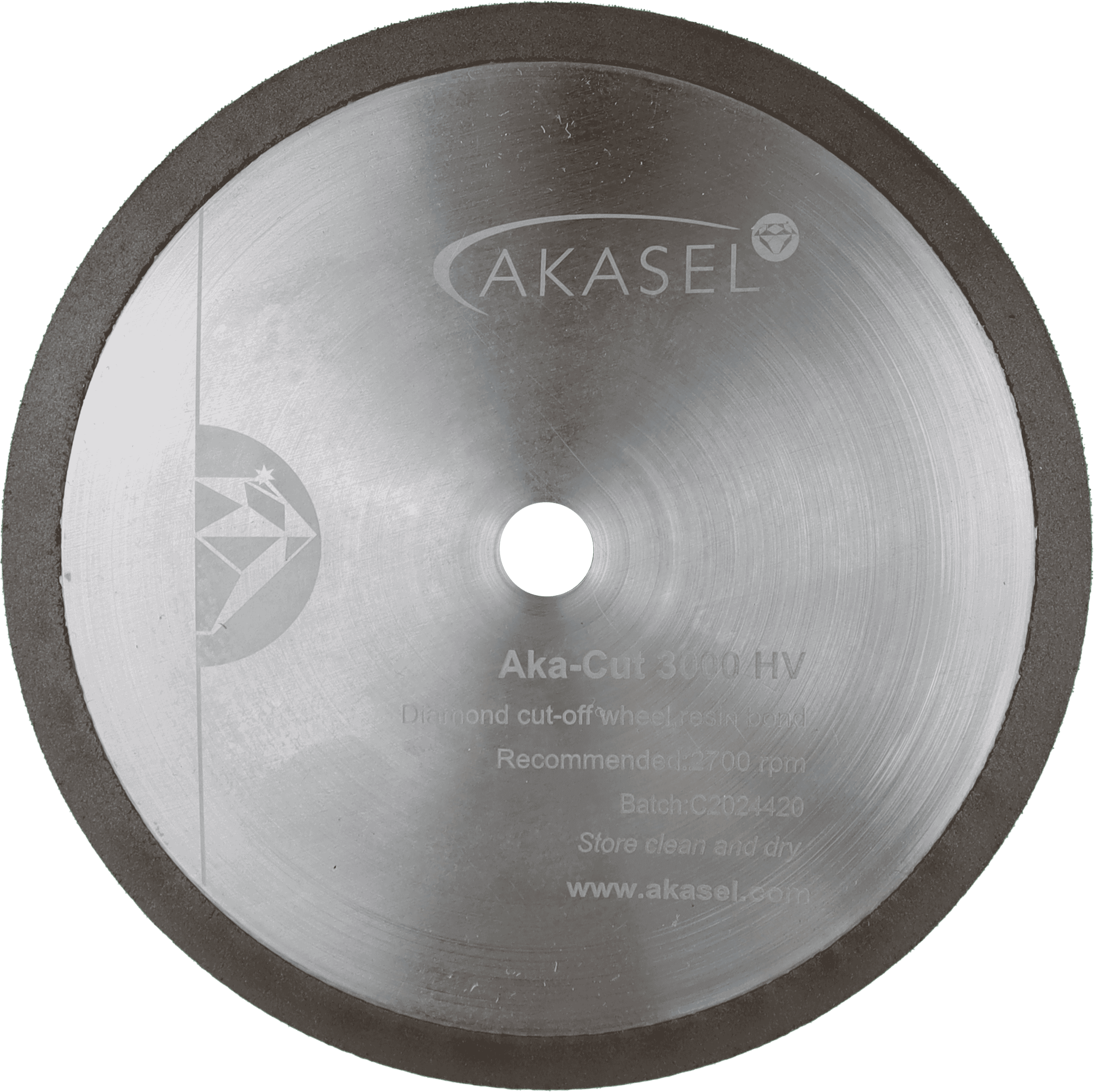 Akasel diamantsnijschijf Aka-Cut 50 HV, 150 mm, met een glanzend zilverkleurig oppervlak en een grijze buitenrand. De schijf bevat opschriften zoals 'Aka-Cut 50 HV', 'Gelelectrodeerde diamant doorslijpschijf', 'Aanbevolen: 2700 tpm', 'Batch: C202453', 'Schoon en droog bewaren' en het websiteadres 'www.akasel.com'. Een centraal gat is voorzien voor bevestiging.