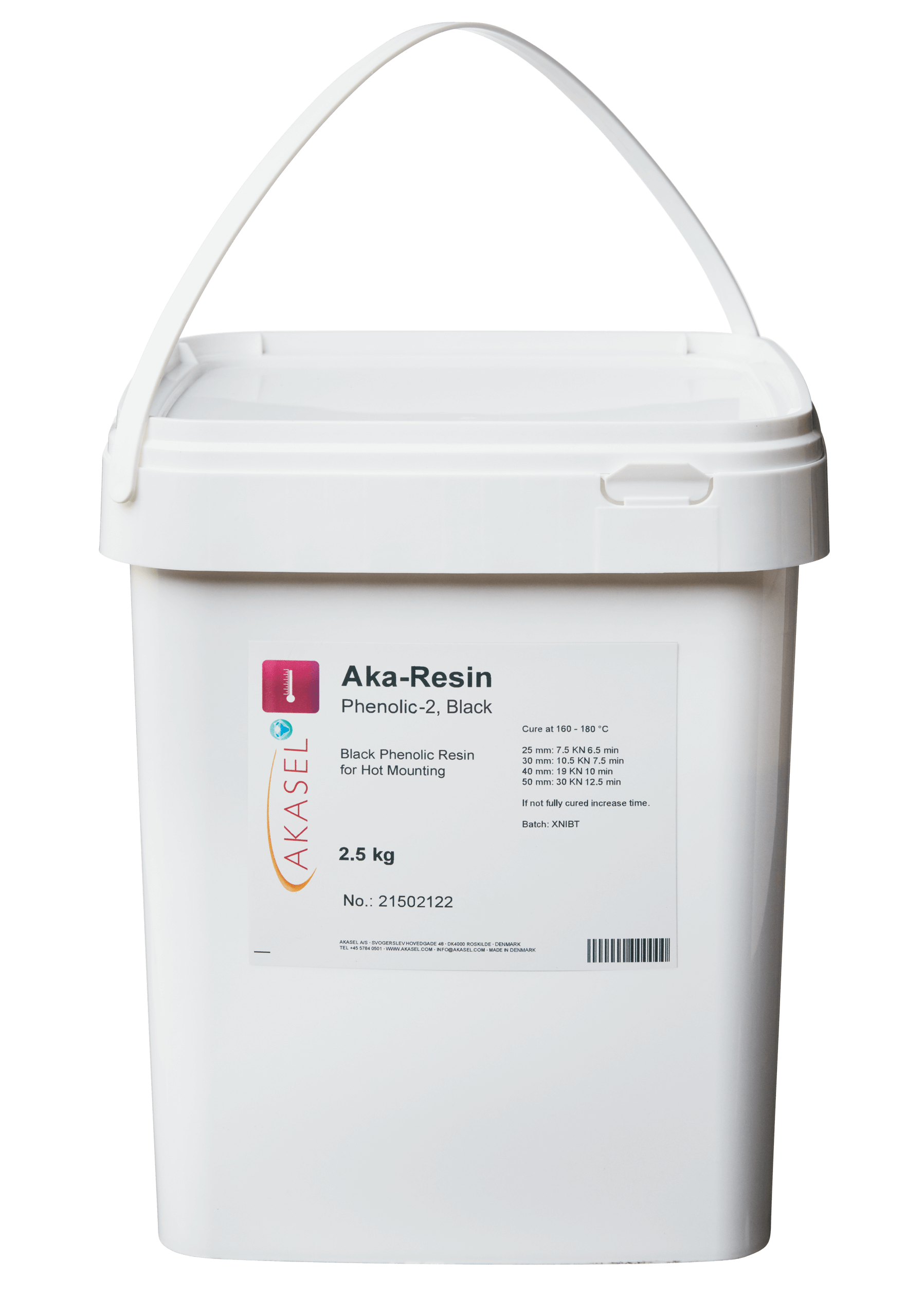 • Akasel Aka-Resin Phenolic, zwarte fenolhars in een witte plastic container met handvat. Het etiket vermeldt de productnaam "Aka-Resin Phenolic," "Zwarte fenolhars voor warmzetten," gewicht 2,5 kg, artikelnummer 21501122 (8055), en uithardingsinstructies bij 160–180 °C. Aanvullende details specificeren uithardingstijden en parameters voor monsters met diameters van 25 mm tot 50 mm. Speciaal ontworpen voor metallografische toepassingen om monsters voor te bereiden voor verdere analyse.